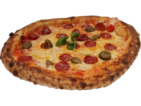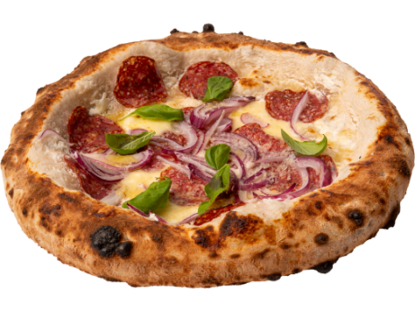 DRCENÁ RAJČATA (SAN MARZANO), MOZZARELA FIOR DI LATTE, PIKANTNÍ KALÁBRIJSKÁ SALÁMOVÁ PASTA ´NDUJA, ČERSTVÁ BAZALKA, EXTRA PANENSKÝ OLIVOVÝ OLEJ | (1,7)